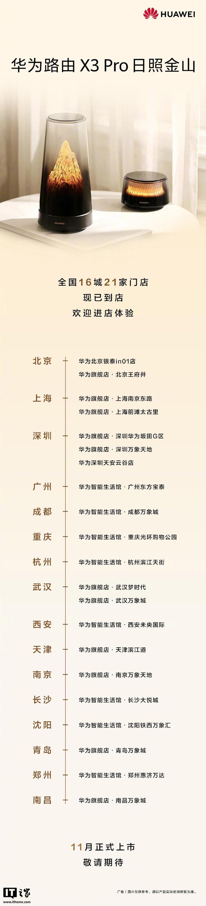 IT之家10月31日报道,华为终端宣布“华为路由器X3 Pro”将于下个月推出。该产品目前在全国16个城市的21家门店有售,覆盖北京/上海/深圳/广州/青岛/长沙/南京等城市。 IT IT 聚集具体门店如下: 华为北京银泰 In01 店 华为旗舰店 ? 北京王府井华为旗舰店 ? 上海南京东路华为旗舰店 ? 上海前滩英尼库里华为旗舰店 深圳店 ? 深圳华为坂田 G 区华为旗舰店 ? 深圳万象天地 华为深圳天安云谷店 广州华为智能生活店 杭州华为智能生活店 ?杭州滨江天街华为旗舰店?武汉梦想时代华为旗舰店?武汉万象城华为智慧生活店?西安未央国际华为旗舰店?天津滨吉路华为旗舰店?娜娜华为Smart生活馆 ? 长沙大悦城 沉阳华为智能生活馆 ? 沉阳铁西万象汇 青岛华为旗舰店 ? 青岛万象城华为智能生活馆 ? 郑州汇集万达诺昌Huaweia Flipsip店 ? 南昌万象城 It Notic Notic Notic Notic 华为Ruta X3 Pro已在京东开放预订。相关页面的关键词暗示了这款路由器的特性,包括:星光网关、Wi-Fi 7、全屋组网套餐。从图片来看,华为路由器X3 Pro的主体呈圆柱形,上部是透明的,可以反射内部的灯光,给人一种类似“阳光照金山”、“雪花落山”的效果。此外,该路由器有两个组件:主要组件和辅助组件。结合“全屋联网套餐”,预计同样支持联网功能。