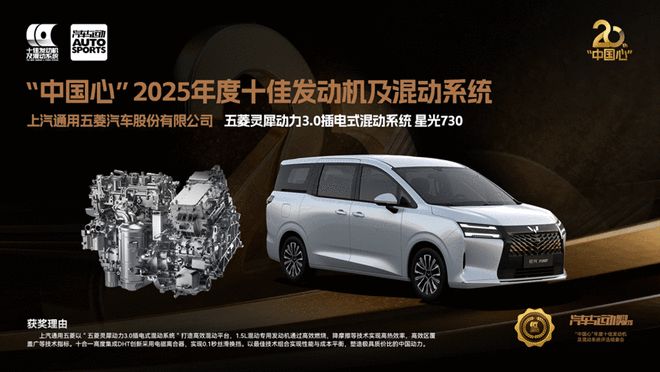 版权声明:本文版权归网易汽车所有。打印时请注明出处。网易汽车11月3日报道,近日,灵犀动力3.0技术首次搭载于上汽通用五菱星光(参数|照片)730,以其“超经济、超动力、超平顺、超可靠”的体验,以及5.3L/100km的超低油耗,成功斩获“2025年中国十大混合动力系统”、“中国汽车中心优质混合动力系统”两项大奖。混合认证”。此外,新车于近期开启预售,共推出四款车型配置:插电式混合动力125公里豪华版、纯电动500公里豪华版、燃油1.5T CVT精英版、燃油1.5T 6MT舒适版。预售价7.68万元-11.28万元,限时置换补贴价7.38万元-10.78万元。新车将于本月内正式上市。这两个认证n个奖项均为国内电力技术领域的最高奖项。 “中国心”年度十佳发动机评选与“沃德十佳发动机”、“国际年度发动机”共同评选出全球三大发动机选择。也是国内汽车动力系统的唯一选择。它代表了中国市场领先发动机产品的技术趋势和制造水平,是对获奖企业在新能源汽车领域取得的成就的高度认可。 CATARC高质量认证是对CATARC技术安全技术进行全方位审查的权威机构,对混合动力汽车的动力性能、能效性能、安全性、电磁指标、噪声水平等进行综合评估。截至目前,灵犀动力已获得发明专利授权54项、权威认证8项、科技发展奖4项、第三方先进认证4项附庸风雅的作家组织。星光730基于五菱原创“天·灵·神”新技术基础打造,提供插电式混合动力、纯电动、燃油三种动力形式。插电混动版采用灵犀动力3.0,由1.5L发动机和第四代10合1电机组成。综合续航里程高达1100km,最低油耗仅为5.3L/100km。纯电动版搭载60kW·h神联电池,CLTC续航里程可达500km,功耗13.6kW·h/100km;汽油版搭载1.5T发动机,最大功率130kW,匹配6速手动和CVT变速箱。同时,五菱还依托通用汽车全球标杆发动机工厂、萨克拉托岛总装线和上汽通用五菱岛智能制造工厂,以精益智能制造保障星光730和灵犀动力3.0的高质量交付,为家庭出行提供坚实的动力支撑。vel。