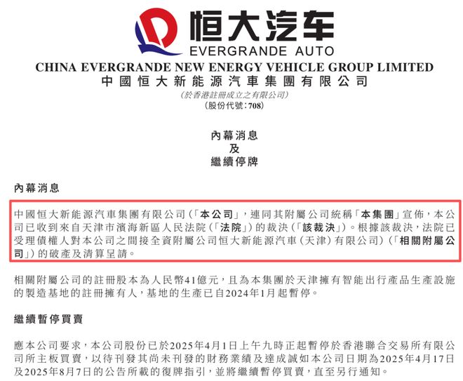 恒大汽车主要生产基地陷入破产清算程序,标志着这家曾经雄心勃勃的新能源汽车公司陷入了深度危机。 11月13日,恒大汽车发布内幕消息公告,宣布公司已收到天津滨海新区人民法院的裁定书。法院正式受理恒大新能源汽车(天津)有限公司破产及避免破产申请。这家注册资本41亿元的子公司是恒大汽车天津智慧出行生产基地的注册所有人,但该基地自2024年1月起已全面暂停生产。恒大汽车自今年4月1日起在香港联交所停牌,并将继续停牌,直至另行通知。天津子公司已破产并正在进行清算。恒大汽车年报确认11月13日,间接全资恒大新能源汽车(天津)有限公司正式向债权人申请破产。天津滨海新区人民法院受理该案,标志着恒大汽车主要资产正式进入破产程序。该子公司注册资本41亿元,是恒大汽车天津智能出行产品生产基地的注册所有人。不过,该生产基地自2024年1月起就已暂停。天津子公司并不是恒大第一个进入破产程序的汽车生产基地。今年4月1日,恒大汽车发布公告称,非直属全资恒大恒驰新能源汽车(上海)有限公司获上海市第三中级人民法院指定指定管理人,负责破产程序。决定书于202年3月26日发出5、6月下旬,广州市中级人民法院还决定批准《恒大新能源汽车(广东)有限公司重整方案》。并终止公司重组程序。事实上,恒大汽车的流动性危机并非一朝一夕发展起来的。该公司在9月30日的公告中承认,“当前的流动性挑战仍将存在,与潜在战略投资者的讨论尚未落实。”为应对资金压力,恒大汽车表示将继续出售非核心资产以支持运营和资金水平。此外,恒大汽车此前公告指出,由于资金水平较低且不足,恒大汽车无法确保某些服务的履行,包括但不限于其审计师和其他相关专业顾问对截至2024年12月31日止的年度进行现场审计。2024年中期报告此前已披露恒大汽车公布,2024年上半年,公司实现净利润3,838万元。公司实现净利润3,838万元,较上年同期的1.54亿元减少75.17%。营收下降的主要原因是恒驰5销量数据下降。显示,截至2024年6月30日,恒大汽车累计交付新能源汽车超过1,429辆。 2024年上半年,恒大汽车净亏损202.56亿元,较去年同期的68.73亿元增加133.8亿元。值得注意的是,恒大汽车上半年亏损超过2023年全年亏损,为119.95亿元。股东 中国恒大已退市 作为恒大汽车控股股东,中国恒大8月从香港联交所摘牌今年25。中国恒大自2024年1月29日起停牌,今年7月28日已连续停牌18个月。停牌前,中国恒大股价仅为0.163港元/股,总市值约21.52亿港元。恒大发布的信息显示,截至2022年6月30日,中国恒大集团负债总额为24.7409亿元,扣除合同负债8543.6亿元后为16.1973亿元。到期未偿债务方面,截至2023年11月末,未偿房地产债务累计约3163.91亿元;此外,恒大地产逾期商业票据累计约2055.37亿元。清盘报告显示,截至2025年7月31日,清盘人已收到187份债权证明,显示针对中国恒大的债权总额约为3,500亿港元狮子(450 亿美元)。相比之下,最终的单独(仅指香港上市生物)中国恒大披露的2022年底财务报表显示,负债价值约为275亿美元。清算人表示,将继续推进清算工作,有序维护和变现集团资产,从而保护中国恒大债权人的最终利益。相关工作包括清算人将继续推进各种正在进行的法律程序,以寻求潜在的高价值追回。