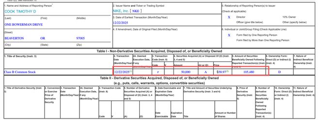 当耐克业绩低迷时,它从董事库克那里获得了额外的5万股股票。当地时间12月23日,美国证券交易委员会(SEC)公布的最新监管文件显示,苹果首席执行官(CEO)库克斥资约295万美元,以每股58.97美元的价格购买了5万股耐克股票。截至12月22日,库克持有约105,000股耐克股票。库克自2005年起担任耐克董事。当年11月,耐克在其官网宣布,耐克已任命时任苹果首席运营官库克为其董事会成员。库克预计将担任董事会薪酬委员会的成员。据外媒报道,自耐克联合创始人菲利普·H·奈特 (Philip H. Knight) 2016 年卸任董事长以来,库克一直领导耐克的指数执行董事,参与了耐克的多项重大决策。外媒援引分析师的话称,这是最大的股指耐克董事或高管在公开市场上的购买,也可能是十多年来最大的一次购买。或许受上述消息影响,耐克的股价将会上涨。截至12月24日收盘,耐克公司(NYSE:NIKE)上涨4.66%。今年以来股价已累计下跌近20%,或将录得股价连续第四年下跌。近年来,耐克业绩面临挑战,尤其是中国市场业绩持续大幅下滑。耐克18日发布的2026财年第二季度业绩显示,第二季度营收124亿美元,同比增长1%;净利润为7.92亿美元,同比下降32%。 2026财年上半年营收241.47亿美元,同比增长1%;净利润为15.19亿美元,同比下降31%。其中,上半年销售额北美地区同比增长7%,息税前利润同比下降7%;大中华区营收同比下降13%,息税前利润同比下降35%,为所有市场中降幅最大的。财报发布后,耐克股价下跌超过10%。距离2024年10月耐克推出“Win Now”转型计划已经过去一年了。当时,在耐克工作了32年的老将埃利奥特·希尔(Elliott Hill)被任命接任集团总裁兼首席执行官。面对市场挑战,他通过普多尔冗余产品线、优化渠道结构、加速区域本地化等措施“进行削减”,将品牌重新聚焦于运动、核心产品、核心市场和高效渠道。然而,这对耐克的盈利影响更大。 “耐克的复苏进程正进入关键阶段。我们继续在优先领域取得进展,并相信当前的举措能够促进该品牌的长期增长和盈利能力。”在这份最新的财务报告中报告中,何彦峰指出,2026财年,耐克集团将继续围绕“Win Now”计划加速行动,包括重组团队、加强合作伙伴关系、优化产品组合、赢得市场一线竞争。优化组织架构一直是衰败的重要突破口,耐克很少重组核心管理层。例如,耐克现任首席供应链官VenkatSi esh Alagirisamy已被任命为执行副总裁兼首席运营官,旨在通过增强供应链的作用来加快运营效率。同时,耐克将大中华区等四个地区的领导直接纳入高层领导管理层,并向全球CEO汇报,实现地区业务与全球战略的直接衔接。