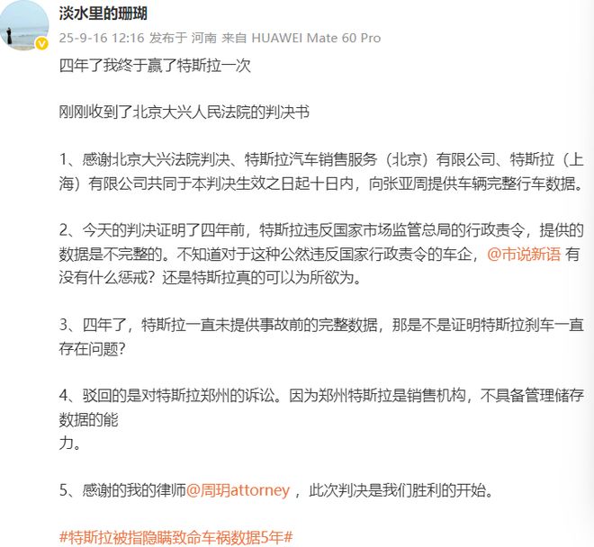 单击上面的“电动Zhijia”以进行遵循,请记住添加☆“星”!据电动Zhijia称,9月16日中午,张女士,特斯拉拥有的Henan(微博ID“ Tamsui的Coral”)在他的个人社会平台??上发布了一条信息,并指出,在获得了四年保护权的权利法之后,他终于开始了取得的成功。达克斯区人民法院的第一入字要求特斯拉向其提供了车辆事故驾驶员的完整驾驶员,并清楚地指出,特斯拉之前存在不完整的数据问题,这违反了州监管机构的行政命令。许多网民认为这一判断是“与巨型公司斗争的重要里程碑”。该事件来自2021年的一次交通事故。后来与公司沟通时,双方在完整性,真实性o上有很大的差异f驱动数据,如果制动系统有任何问题。尽管针对市场法规的州管理公司已下令特斯拉在2021年初提供完整的数据,但张女士说,该公司尚未满足其要求。判决表明,法院需要特斯拉汽车销售服务(北京)有限公司和特斯拉(上海)有限公司,在判决判决后的十天内涉及涉及的完整车辆驾驶数据。值得注意的是,在今年7月11日的前夕,上海Qingpu地区人民法院对原始判决做出了第二次灭亡判决,并被称为张女士,亨南女士是Lumpedtesla(上海)Co.应在10天内向“法治每日法治”发表书面道歉,并为经济损失支付170,000元人民币;在这两种情况下,另一位组织者和媒体人员也因向公众道歉并支付25万元人民币而受到惩罚。 2021年4月19日,在上海Aut上o展示媒体日,张女士穿着一件白色T恤,上面印有“大脑失败”,站在特斯拉的表演车的屋顶上,大声喊叫,现场视频很快就忽略了整个网络。随后,张女士受到了五天的行政限制惩罚,而特斯拉根据侵犯声誉的行为提起诉讼。 2024年5月30日,法院的第一个例子发现,张女士“没有任何势力来证明该案涉及的车辆发生了刹车失败”,他的行为对特斯拉形成了诽谤,并命令他向公众道歉并支付172,275元。判决清楚地指出,此案是关于产品权利的争议,而不是与法院的争议。做出现实的决心,如果车辆实际上在刹车上失败了。 7月11日晚上,张女士在他的个人微博 @天子子子中:“息件事实不是客观的现实。个人与企业之间的审判是战争 - 战争 - 他说,他将继续促进销售合同,数据完整性和产品质量责任与特斯拉一起造成争议的案例。他的成功正是他所说的“数据完整性”案例。他的制动系统中的问题也呼吁监管机构进行干预,“对明显违反行政国家命令的公司会有一个PARUSA吗? “这不是特斯拉在数据驾驶问题上首次引起争议。在过去的五年中,包括美国,欧洲和中国市场,特斯拉一再被指控“选择性披露数据”或“与自主驾驶有关的不透明致命事故。