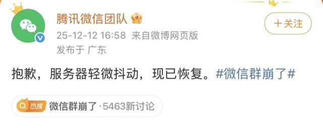 论文2025-12-12 18:39:08@腾讯微信团队 12月12日,腾讯官方微信团队针对“微信群崩溃”发帖回应:抱歉,服务器轻微晃动,已恢复。本期编辑邹山