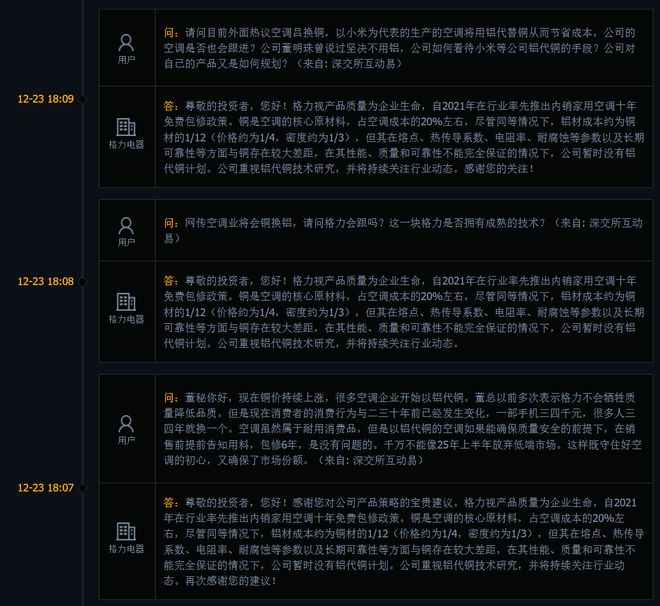 据IT之家12月24日消息,格力电器12月23日在其互动平台表示,公司目前没有以铝代铜的计划。格力电器表示,铜是空调的主要原材料,约占空调成本的20%。虽然在同等情况下,铝的价值约为铜的1/12(价格约为1/4,密度约为1/3),但它在熔点、导热系数、电阻率、耐腐蚀性等参数以及长期可靠性方面与铜存在较大差距。由于其性能、质量和可靠性无法得到充分保证,该公司目前没有计划用铝替代铜。公司非常重视铝替代这项技术的研究,并将持续关注行业动态。综合IT之家此前报道称,12月1日1日,海尔、美的、小米等企业联合宣布,将遵守空调《空调铝强化应用研究工作组自律公约》,表示将为“铝”空调技术突破和高质量发展注入动力。 12月14日,格力电器董事长董明珠在讨论空调行业“铝代铜”问题时回应新浪科技:铝能“代铜”吗?它是可以替代的,因为我们多年来研究铝技术,但我们仍然坚持不使用“铝代铜”,因为它还没有达到与铜相同的技术条件和保证。董明珠总结道,所以我们没有说不研究,我们真的会研究到铜完全被铝取代,我一定会投资铝。中国家用电器展览会家电协会12月22日发布文件称,随着铜价再度上涨并突破历史纪录,家用空调行业的“铝代铜”再次成为热议焦点。热议的背后,是对行业发展和民生需求的综合考量——“铝代铜”不是瘟疫,但前提不能降低到质量,消费者的知情权和选择权不能丧失。文章指出,铜具有优异的导热性、耐腐蚀性、延展性和焊接可靠性,是空调热交换器的理想材料。保证空调热交换效率高、系统稳定、寿命长,广泛应用于各类空调系统。 “铝代铜”是空调行业探索的技术方向这并不是一场“一刀切”的行业转型。铝具有密度低、成本低、加工方便等优点。通过技术研发,一些企业已经实现了铝制换热器在特定车型上的稳定应用。