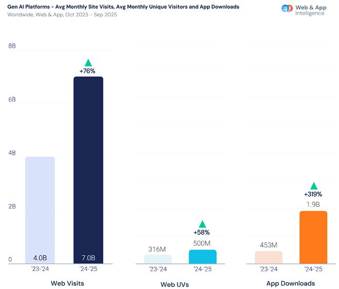 生成式人工智能正在从一种新颖的工具发展成为互联网基础设施的核心层。近日,据Dumandweb公布的数据显示,2025年9月全球AI服务月访问量将达到约70亿次,同比增长76%,流量规模与各大社交网络相当。这种增长不仅在网页上可见。移动端扩展更快。过去一年,AI应用会话数量增长了五倍,应用下载量增长了778%。 Chatgpt 仍然是流量领先者,9 月份的访问量约为 59 亿次,位列全球访问量最大的网站前五名。用户结构也在发生变化。尽管18岁至34岁的用户仍占主导地位,但45岁及以上的用户群体增长最快,目前占总访问量的近30%。这表明AI技术正在打破尝鲜者圈子,渗透到更广泛的人群中。数据还表明人工智能聊天机器人尚未取代传统搜索引擎。在 ChATGPT 的 4.62 亿访问者中,95% 的用户还使用 Google,这表明用户根据不同的任务在会话式 AI 和搜索引擎之间切换。 chatgpt 占全球 AI 流量的 80%。 Chatgpt 的市场主导地位依然强劲。 Openai 平台的月访问量从 2022 年的约 1900 万次增长到 2025 年 9 月的约 59 亿次,使其成为全球访问量最大的五个网站之一,此外 Instagram 的月访问量为 65 亿次。尽管面临 Gemini、Claude 和 Peclexity 等竞争对手的挑战,ChATGPT 仍占据全球 AI 访问量的近 80%。这种压倒性的优势体现了先发平台对于培养用户习惯的壁垒效应。人工智能和搜索引擎呈现出并行的使用模式。类似数据显示,人工智能聊天机器人并没有取代传统搜索引擎,而是开发了并行使用模式。 ChATGPT 的 4.62 亿访问者中,95% 也是 Google 用户,其中 Overlay 用户达到 4.41 亿。这意味着用户将根据特定任务在对话式人工智能和搜索引擎之间切换。从用户粘性来看,ChATGPT明显领先。在美国市场,ChatGPT移动应用拥有4130万月活跃用户,其中33%每天都会打开该应用。相比之下,Confusion(340万月活跃用户)和Microsoft Copilot(310万月活跃用户)的日活跃率为5%至17%,反映出较为零星的使用习惯。中老年用户成为增长最快的群体。用户的年龄结构正在发生显着变化。虽然 18 岁至 34 岁的用户仍然是最大的群体,拥有 19 亿用户(53%),但 45 岁及以上的用户增长最快,目前占所有访问者的近 30%。这一趋势表明人工智能的发展正在蔓延超越早期采用者阶段并进入主流。 A中老年用户加速涌入,意味着AI工具的易用性和实用价值得到更广泛的认可。 AI功能的集成仍处于实验阶段。人工智能技术与现有平台的集成正在扩大。谷歌的“AI模式”成为美国市场访问量最快达到1亿次的AI功能,这得益于该公司庞大的用户基础。不过,数据显示,这种集成功能的使用仍处于实验阶段。在两个月的观察期内,超过一半的用户仅在一天内与该功能进行过交互,表明用户尚未养成稳定的使用习惯。这一现象的特点是,将AI能力深度嵌入现有产品生态、培育用户行为仍需时日。