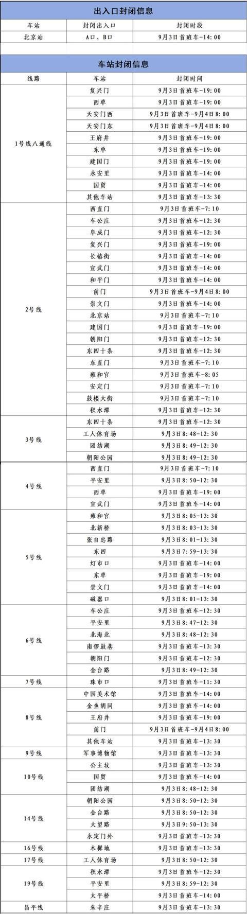 重要的旅行提示根据“中国战争方法对日本入侵和世界反法西斯战争成功80周年的临时交通管理通知”,以确保会议的安全性和平稳性,一些地铁和车站线将进行以下操作。请合理调整您的旅行路线。感谢您的理解和支持! September 3, 2025 operating lines information will start from the first bus to 19:00 (except for the constant closure of stations), and some stations and entering and exiting the Metro 1 line, rock line, 2, 3, 4, 5, 6, 7, 8, 9, 10, 14, 16, 17, 19, and some stations and entrances and the entrance to the change. 2。从第一巴士到13:30,将悬挂石头和第8行的所有线路,并同时关闭和转移一些相关的转移站;操作将在13:30恢复(除了不断关闭电台外)。 3。从第一个B起美国至7:10,暂停第2行,一些相关的转移站将同时关闭和转移;运营将在7:10继续(除了连续关闭电台外)。 4。从7:59到11:45,第5行将在各部分中运行,从Tiantongyuan North到Hepingli North Street和Tianantan East Gate到Songjiazhuang。在此期间,一些相关的转移站关闭,并将同时停止移动;整个操作可以从11:45恢复(除了电台的不断关闭)。请参阅下表,以获取上述操作的时间。乘客被要求使他们的P Thearlano在旅行上。有关详细信息,请致电Subway Service Hotline 96165。(北京每日客户)